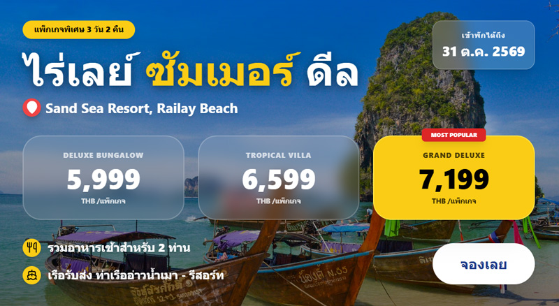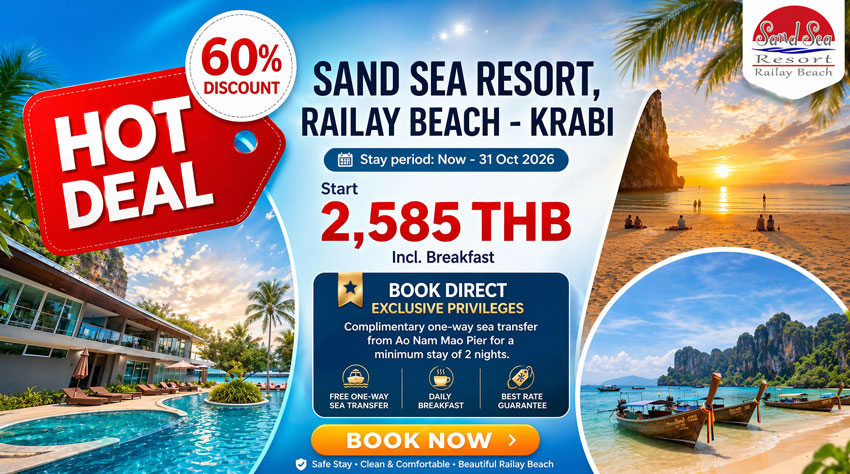 With it’s stunning views across majestic limestone outcrops, golden sands and the beautiful clear, turquoise waters of the Andaman Sea it’s easy to see why Railay Beach is regarded as one of the most beautiful beaches in the world. And with our choice of private, luxurious bungalows and suites you can be sure your stay at the Sand Sea Resort will be a holiday you’ll never forget.